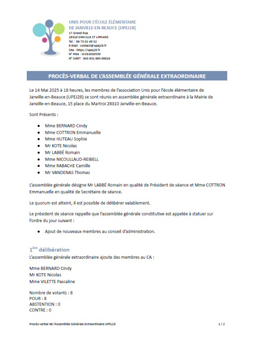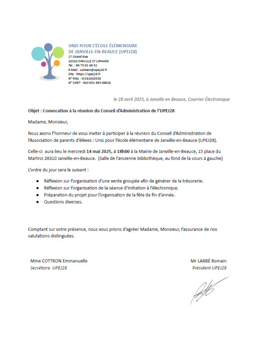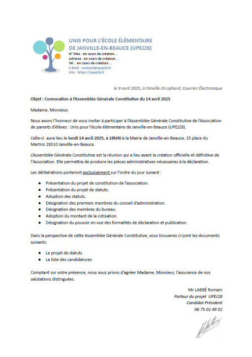 Nous vous convions le mercredi 14 mai à 18h à la Mairie de Janville en Beauce pour une Assemblée Générale Extraordinaire de l'association "Unis pour l'École Élémentaire de Janville-en-Beauce (UPEJ28)" et à la première réunion du Conseil d'Administration.