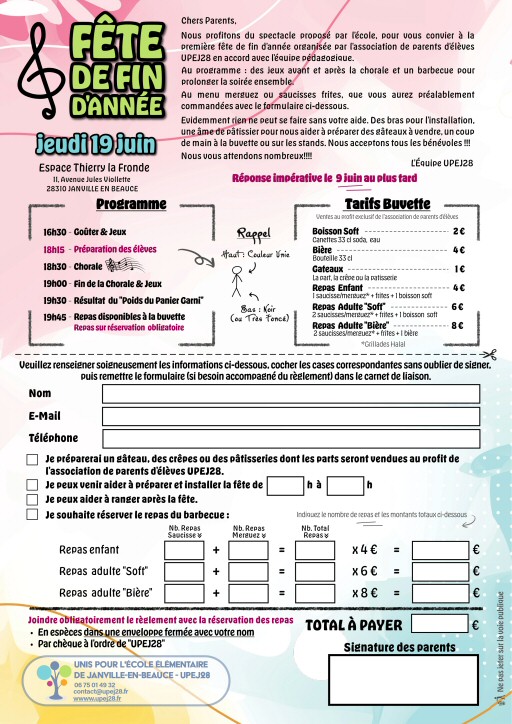 Nous profitons du spectacle proposé par l’école le jeudi 19 juin à partir de 16h30, pour vous convier à la première fête de fin d’année organisée par l’association de parents d’élèves UPEJ28 en accord avec l’équipe pédagogique.