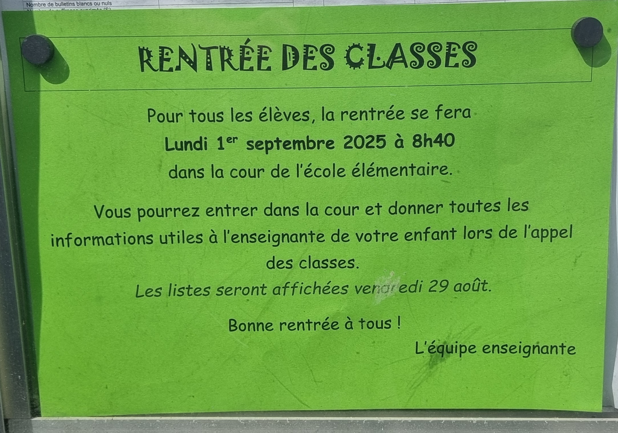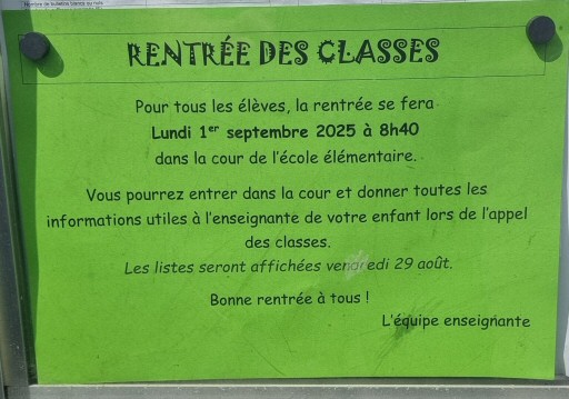 Pour tous les élèves, la rentrée se fera Lundi 1er septembre 2025 à 8h40 dans la cour de l'école élémentaire.