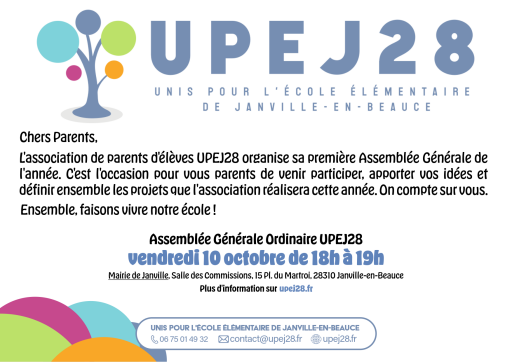 L'association de parents d'élèves UPEJ28 organise sa première Assemblée Générale de l'année. C'est l'occasion pour vous parents de venir participer, apporter vos idées et définir ensemble les projets que l'association réalisera cette année. On compte sur vous.