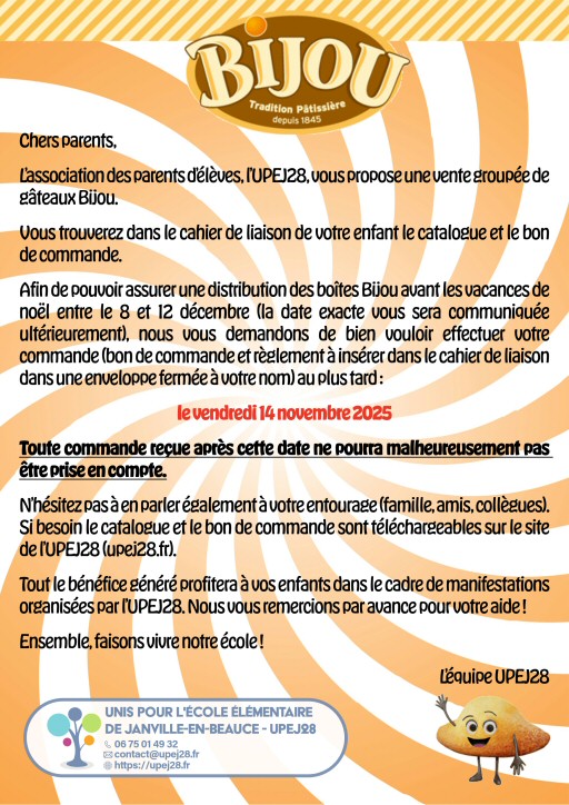 Afin de pouvoir assurer une distribution des boîtes Bijou avant les vacances de noël (nous vous communiquerons la date de distribution ultérieurement - a priori entre le 8 et 12 décembre), nous vous demandons de bien vouloir effectuer votre commande (bon de commande et règlement à insérer dans le cahier de liaison dans une enveloppe fermée à votre nom) au plus tard le vendredi 14 novembre 2025.
